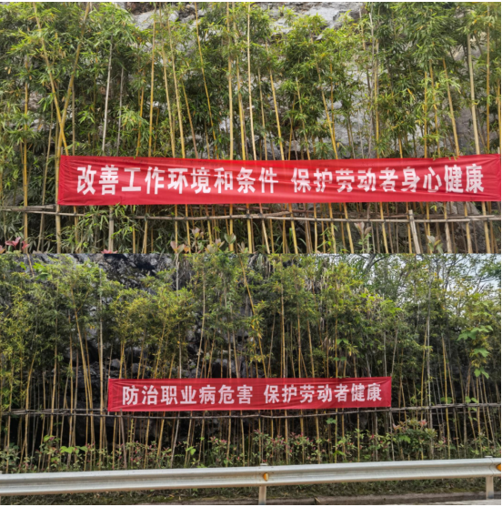 為使宣傳活動更深入人心,在礦山道路兩旁懸掛宣傳橫幅,時刻提醒各崗位職工的健康防護(hù)意識。